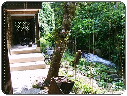 Behind the house next to the stream of water on the high mountain.